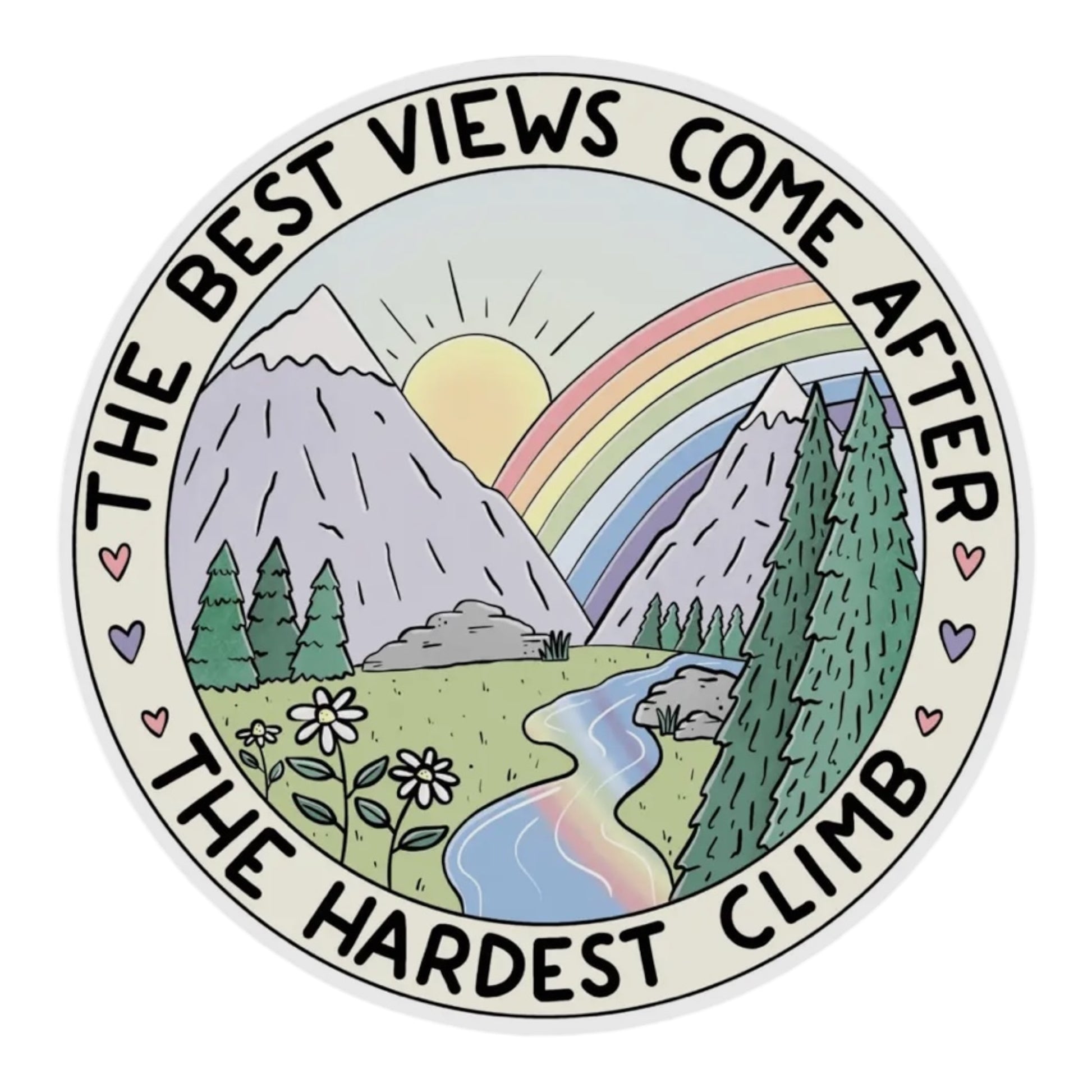 Adorn your possessions with this 3" round vinyl sticker featuring a picturesque mountain landscape and the motivating phrase, "the best views come after the hardest climb." A reminder to keep pushing through challenges and obstacles to reach the spectacular views waiting for you.